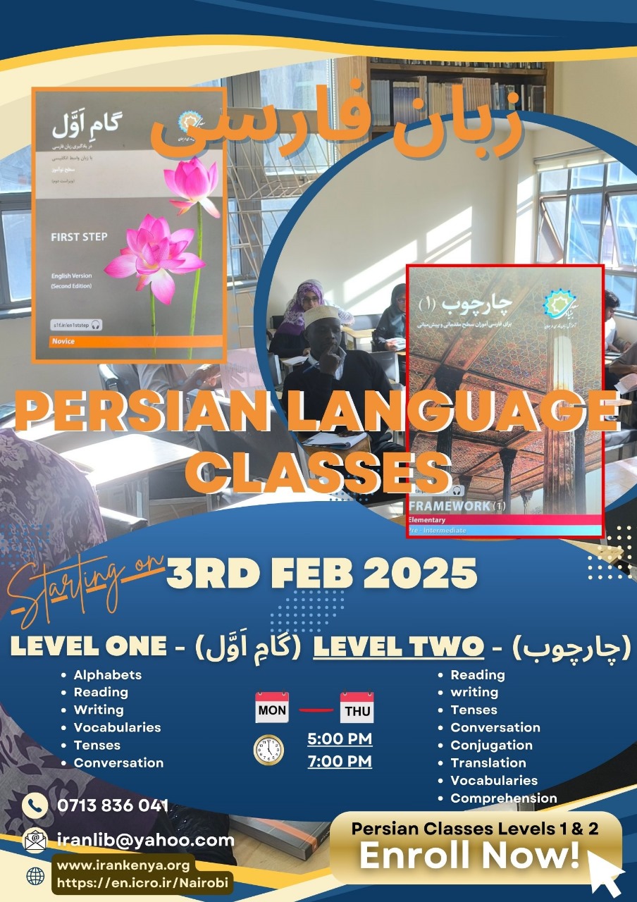 The Cultural Council of the Embassy of the Islamic Republic of Iran in Nairobi is delighted to announce the commencement of Persian Language Classes for beginners (Level 1) and intermediate learners (Level 2).