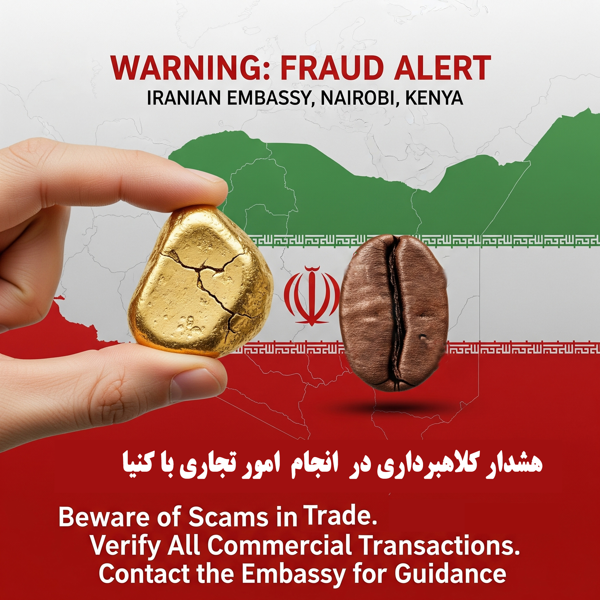 با توجه به گزارش‌های متعدد از موارد اخیر کلاهبرداری و اخاذی در زمینه‌های تجاری، به ویژه در حوزه‌های مرتبط با طلا و قهوه، سفارت جمهوری اسلامی ایران در نایروبی به هموطنان گرامی هشدار می‌دهد:
